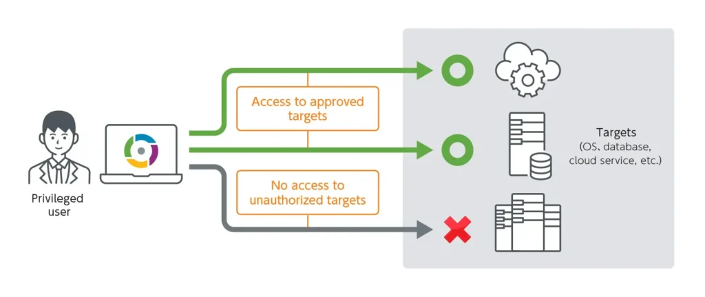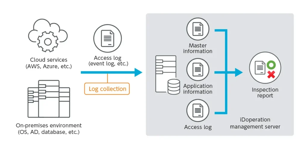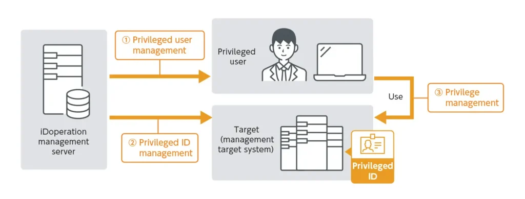 iDoperation captures privileged IDs from a management target system (hereinafter referred to as the target) and visualizes privileged IDs in the organization. The administrator can visualize privileged IDs, privileged users and privileged access usage rights by registering privileged users and setting permissions. iDoperation also automates administrator tasks such as periodic password changes and account matching. Administrators can understand management status simply by checking the outcomes of password changes or account inspection.